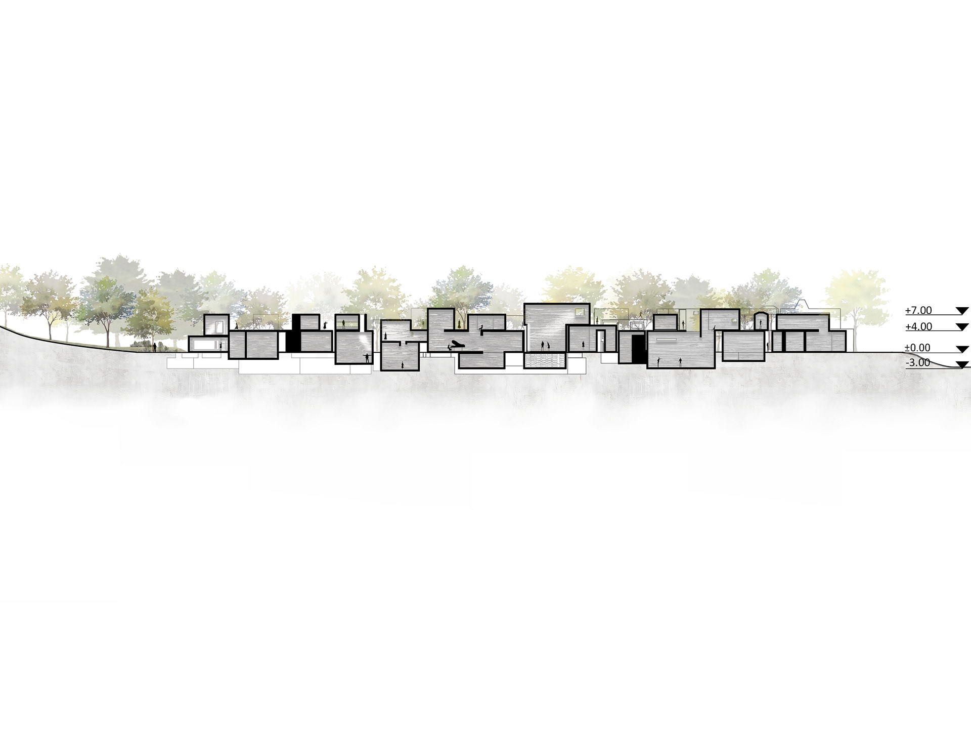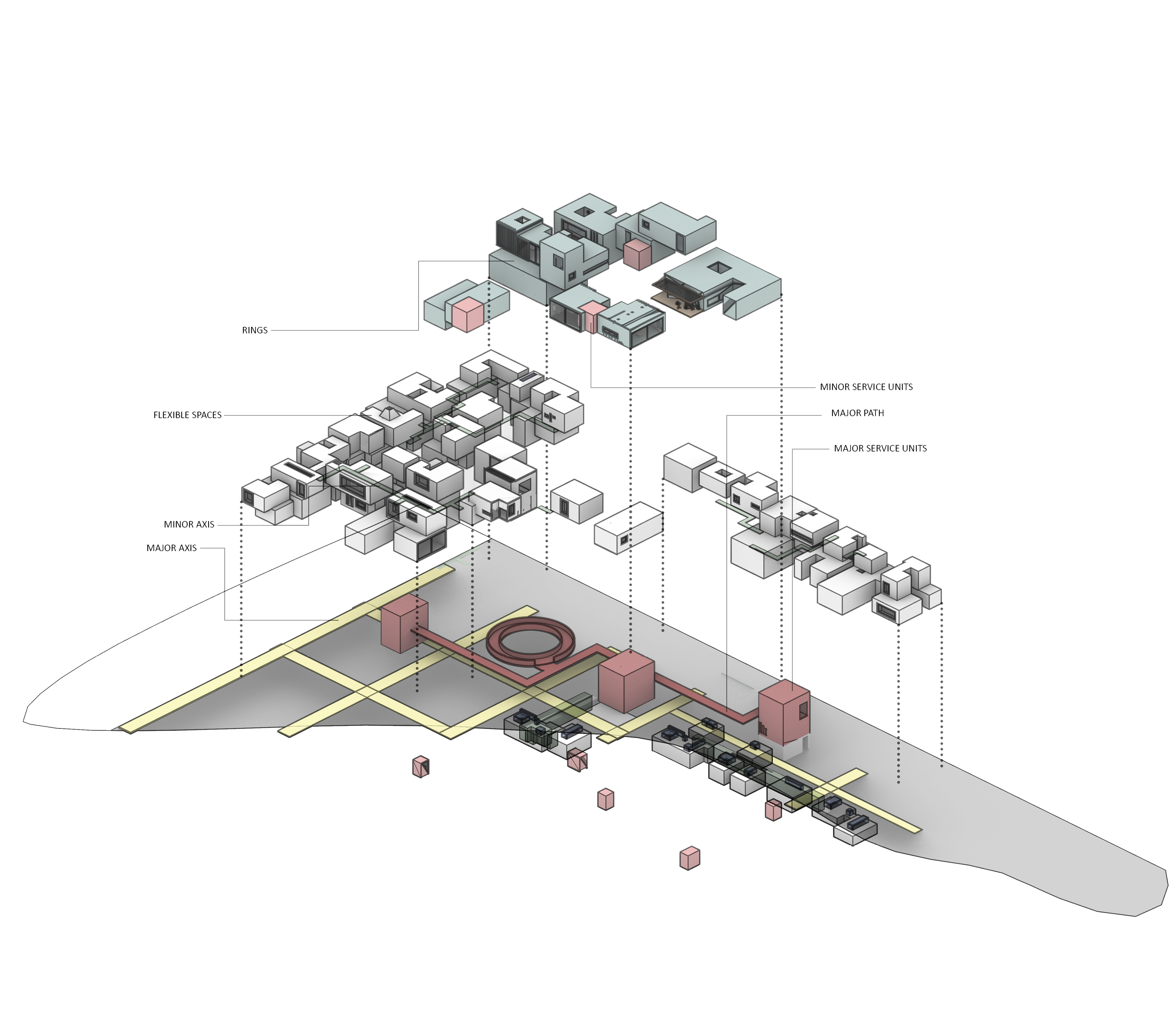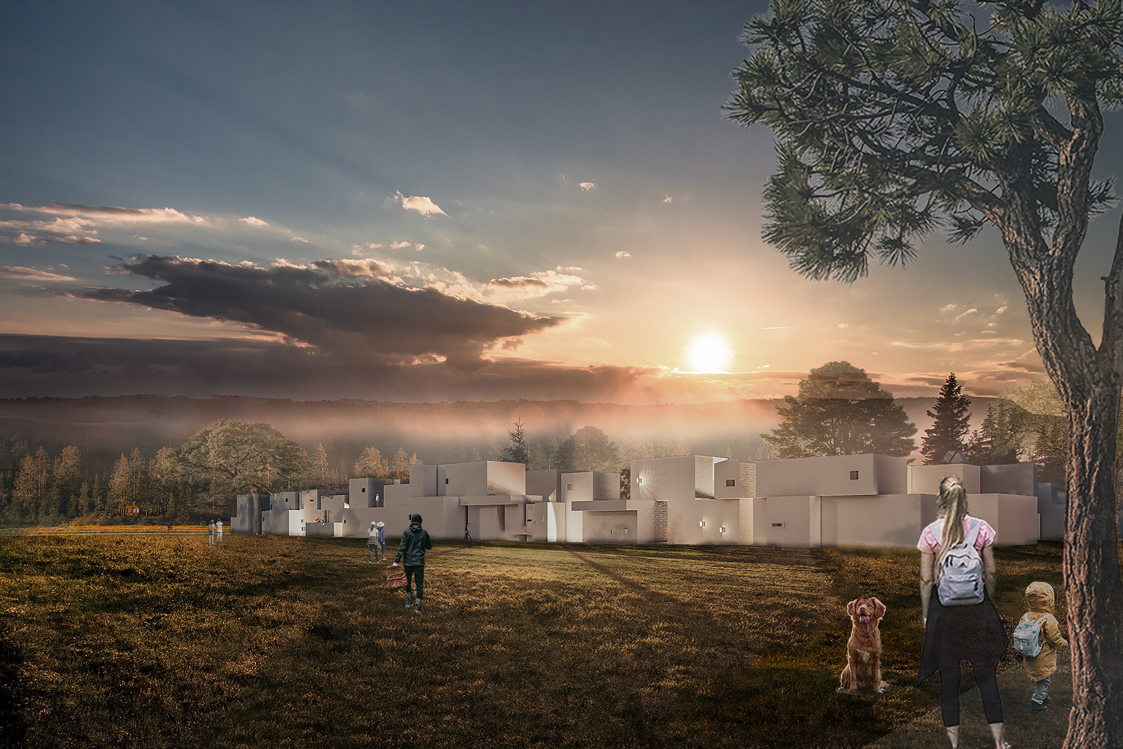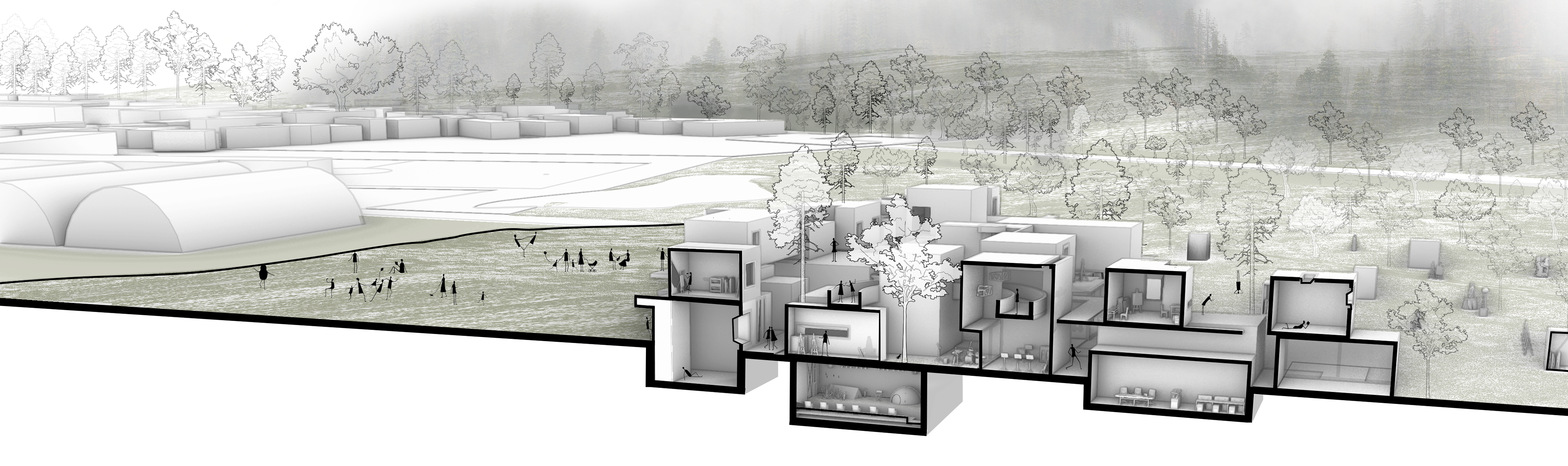 Een publiek plein, gevormd door het terugleggen van de bouwvolumes, gecombineerd met ateliers, expositieruimtes en woon- en verblijfsunits voor kunstenaars als een collectieve culturele hub.