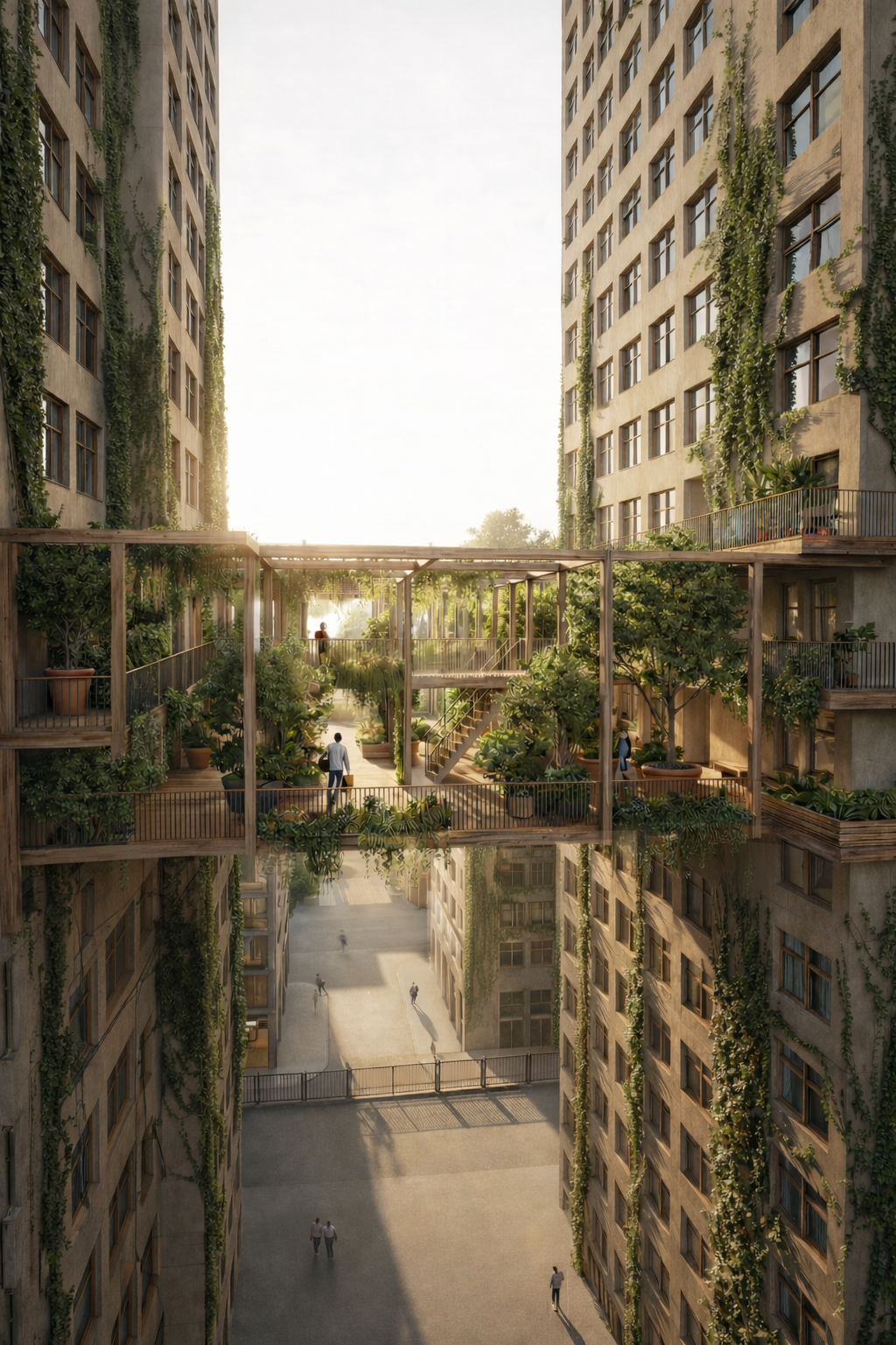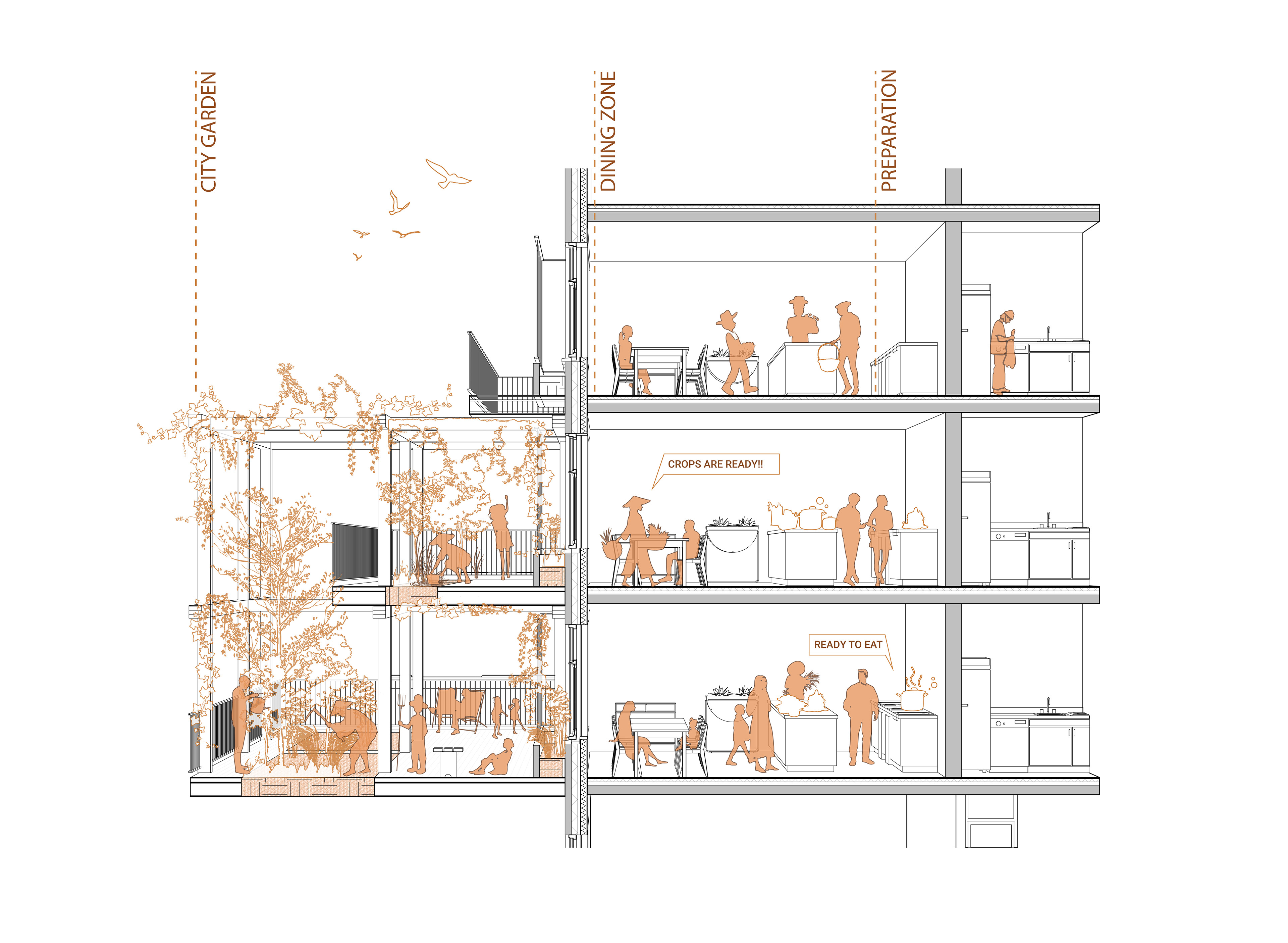 Instead of a single public ground layer, the design proposes a system of intermediate layers positioned between buildings. These spaces form a productive urban field where planting, harvesting, learning, and collective eating become spatial experiences that reconnect people with natural cycles and with each other.